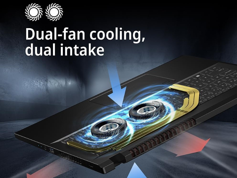 Các quạt kép được thiết kế với cánh quạt mỏng và mạnh mẽ, giúp tăng cường luồng không khí lưu thông qua các linh kiện bên trong. Điều này không chỉ giúp làm mát nhanh chóng mà còn giảm thiểu tiếng ồn, mang lại trải nghiệm sử dụng yên tĩnh hơn. Các ống dẫn nhiệt bằng đồng được bố trí hợp lý, giúp phân tán nhiệt độ từ CPU và GPU ra khỏi máy, ngăn chặn tình trạng quá nhiệt.