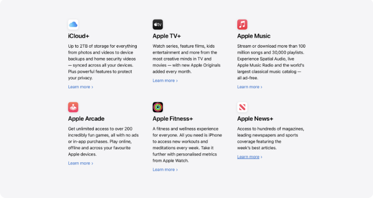 Đây là dịch vụ cung cấp các video tập thể dục do huấn luyện viên chuyên nghiệp hướng dẫn thông qua màn hình iPad, Apple TV với Apple Watch. Hiện Apple Fitness+ có mặt tại 21 quốc gia, trong ĐNÁ có Indonesia & Malaysia.