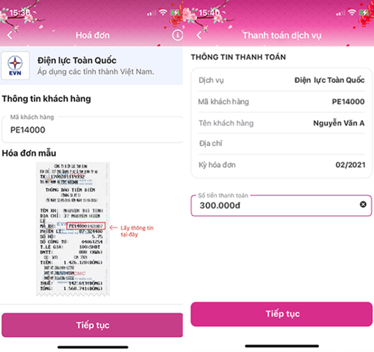 Bạn hãy nhập mã khách hàng, chọn Tiếp tục kiểm tra thông tin và xác nhận thanh toán.