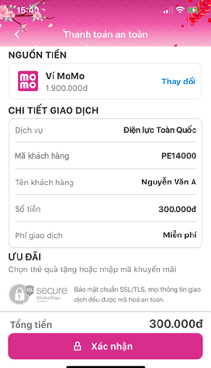 Sau cùng, bạn kiểm tra thông tin hóa đơn. Nếu đã chính xác, chọn “tiếp tục” để tiến hành thanh toán. Tại mục Ưu đãi, chọn sử dụng thẻ quà tặng nếu có. Sau đó chọn “Xác nhận” để tiến hành thanh toán hóa đơn.
