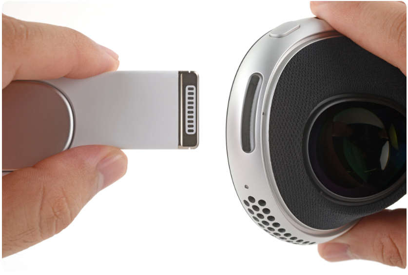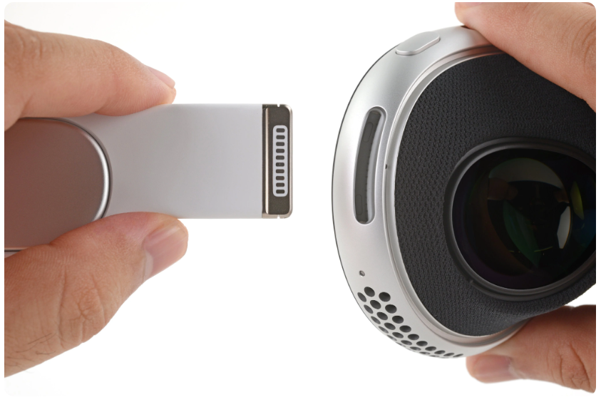Cổng cắm này kết nối phần tai nghe với cụm kính Vision Pro và nó to hơn cổng lightning trên cục pin rất nhiều.