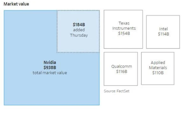Hiện Nvidia đã trở thành công ty niêm yết lớn thứ 5 thế giới xét theo giá trị vốn hóa, lớn gấp 8 lần so với Intel, ông lớn khác của ngành chip có doanh thu gấp đôi so với Nvidia trong năm ngoái.