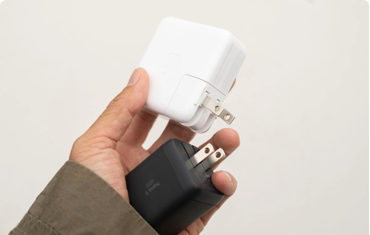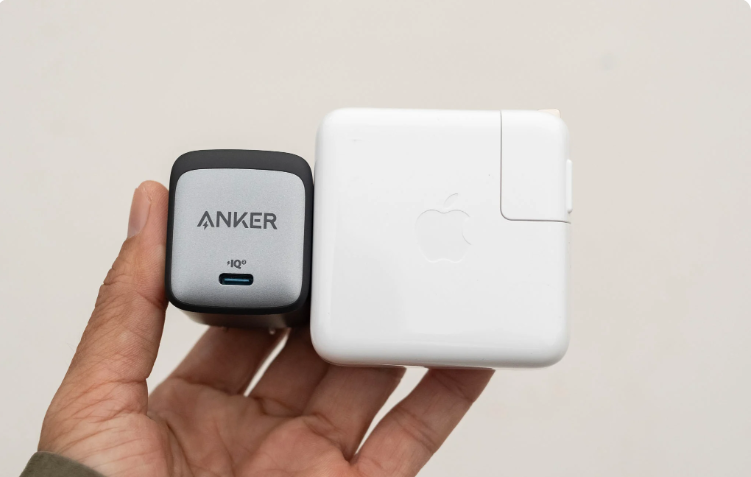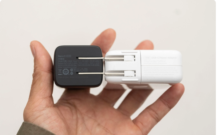 Cục Anker 65W nhỏ hơn cục Apple 70W rất nhiều nếu nhìn từ hướng này. Tuy nhiên thực tế bên ngoài thì cũng không quá nhiều như hình này.