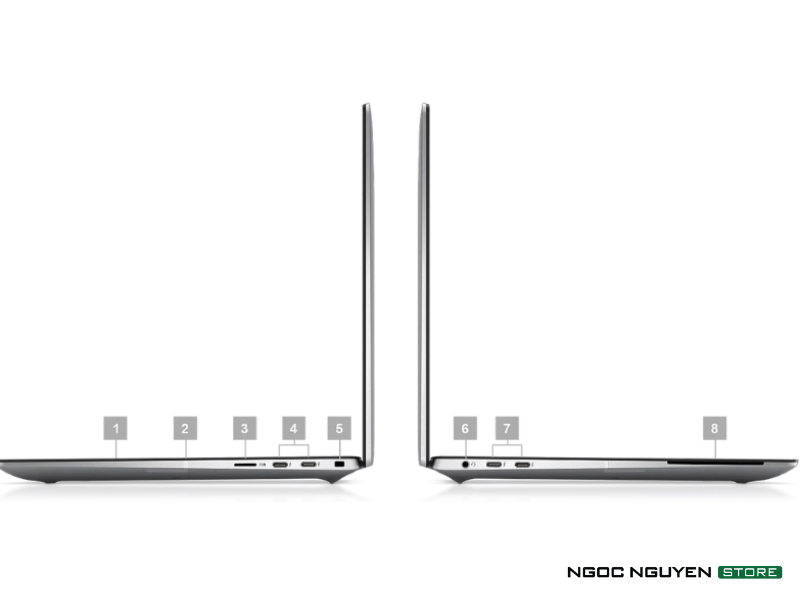 Về điểm này, Dell cũng đi theo xu hướng chung của các dòng máy tính xách tay hiện nay là loại bỏ các cổng kết nối truyền thống như USB-A, HDMI và thay thế tất cả bằng một cổng duy nhất - ThunderBolt. Trên Dell Precision 5470 2022 sẽ có 4 cổng Type-C hỗ trợ ThunderBolt 4 mới nhất, cùng với jack cắm 3.5mm và khe cắm thẻ nhớ SD. Vị trí 1 và 2 sẽ là một công nghệ mới mà Dell gọi là "cảm biến xâm nhập khung gầm" và ăng-ten.