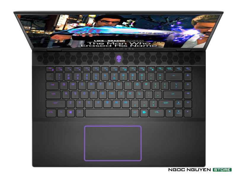 Bàn phím của Alienware M16 R2 sẽ là dạng tenkeyless, không có phím số phụ và thiên nhiều hơn về chơi game. Hành trình phím không quá sâu nhưng bù lại có độ nảy tốt, phản hồi nhanh. Máy có LED RGB từng phím rất đẹp mắt, bạn có thể điều chỉnh đa dạng hiệu ứng trong phần mềm Alienware Command Center.