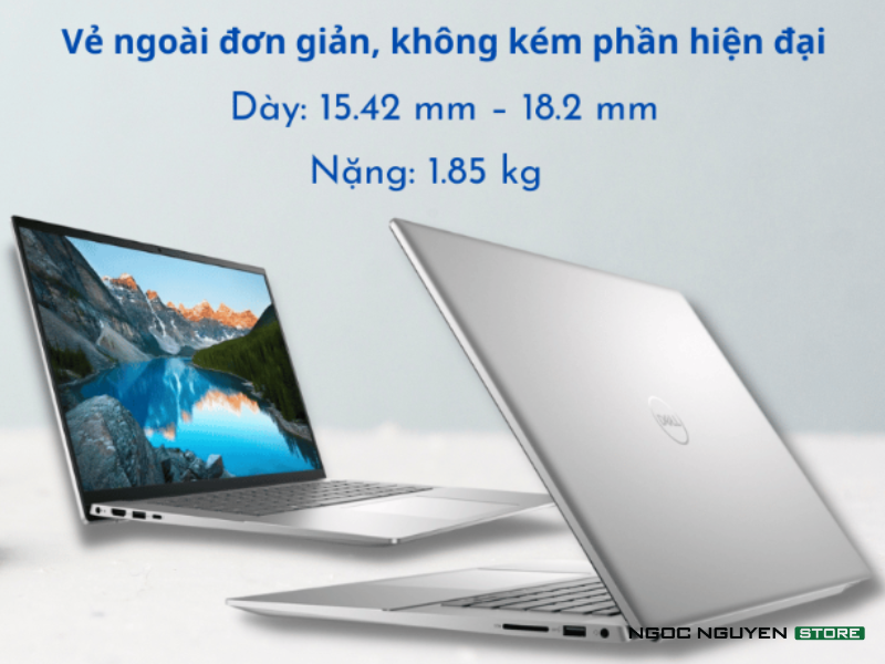 Dell Inspiron 5630 có vỏ kim loại màu bạc rất hiện đại và sang trọng, bề mặt sờ vào rất mát tay. Với trọng lượng 1,85 kg, không quá nặng để bỏ trong ba lô đi học hay đi làm. Ngoài ra, laptop Dell còn có thông số độ dày vừa phải từ 15.42 mm – 18.2 mm giúp mình cầm nắm dễ dàng hơn, cầm bằng một tay cũng không thành vấn đề.