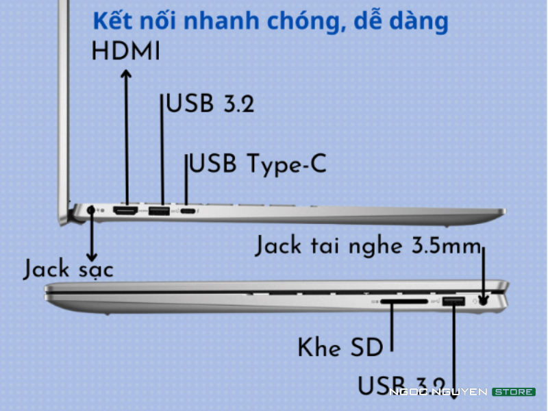 Hai bên thân máy Dell Inspiron 5630 được bố trí các cổng giao tiếp đáp ứng mọi nhu cầu kết nối thiết bị ngoại vi như USB 3.2, jack cắm tai nghe 3.5mm, USB Type-C (cổng cấp nguồn và màn hình), HDMI và khe đọc thẻ nhớ SD. Kết nối chuột và bàn phím với hai cổng USB 3.2 hoặc bạn cũng có thể sử dụng cổng HDMI để xuất bài thuyết trình khi cần hoàn thành bài thuyết trình nhóm trên lớp.