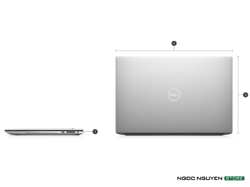 1. Dày: 0.77 in. (19.50 mm) | 2. Chiều rộng: 14.74 in. (374.45 mm) | 3. Chiều cao: 9.76 in. (248.05 mm) | Trọng lượng: 5.10 lbs. (2.31 kg)* cho máy với tuỳ chọn FHD+ Non-Touch; 5.37 lbs. (2.44 kg) cho máy có với tuỳ chọn UHD+ Touch .