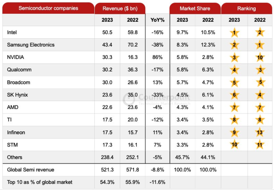 Doanh thu của Intel cũng sụt giảm nhưng mức giảm không nghiêm trọng như Samsung. Vì thế, hãng sản xuất chip của Mỹ đã vượt qua Samsung để giành vị trí số một thị trường chip toàn cầu vào năm 2023.