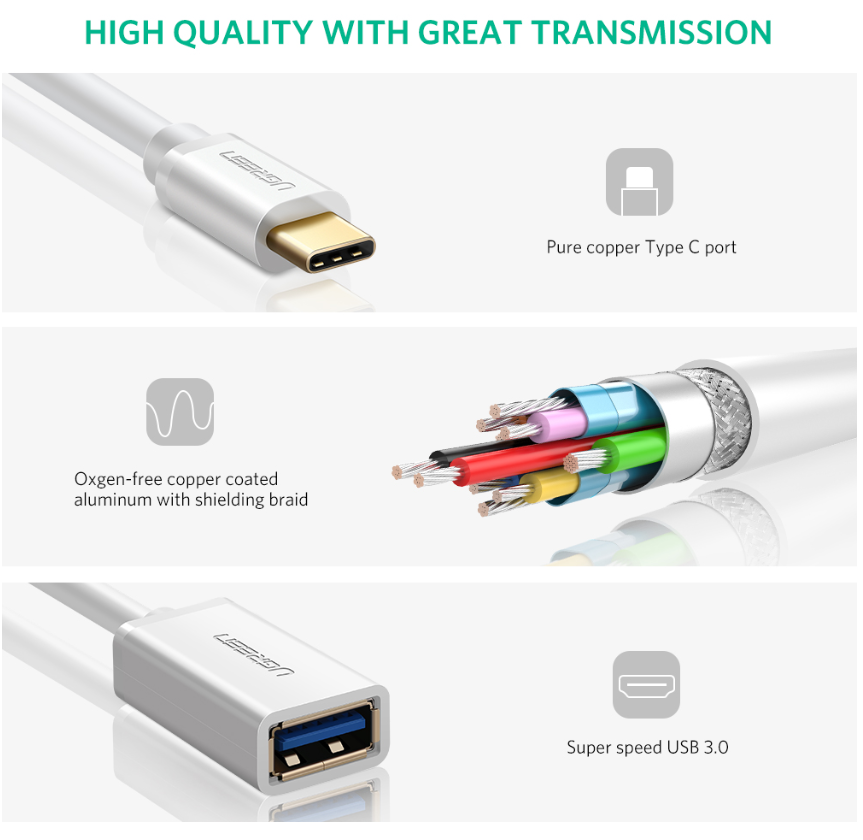 Cáp USB Type C OTG Usb 3.0 chính hãng Ugreen 30702 được sản xuất bằng nguyên vật liệu cao cấp như: Lõi dây thuần đồng 100%, đầu giắc cắm mạ vàng 24K, chất liệu vỏ nhựa PVC cao cấp mang đến hiệu năng tối ưu, khả năng chống chọi ảnh hường từ môi trường tốt hơn, độ bền vượt trội theo thời gian dài sử dụng.