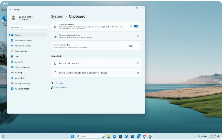 Đối với máy tính Windows, trước tiên anh em vào Settings → Clipboard → bật Clipboard History → bật tiếp Sync across your devices. Tính năng này sẽ được đồng bộ qua tài khoản Microsoft.