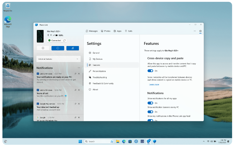 Sau khi kết nối Phone Link với điện thoại, vào Settings → Features → bật Cross-device copy and paste là xong.
