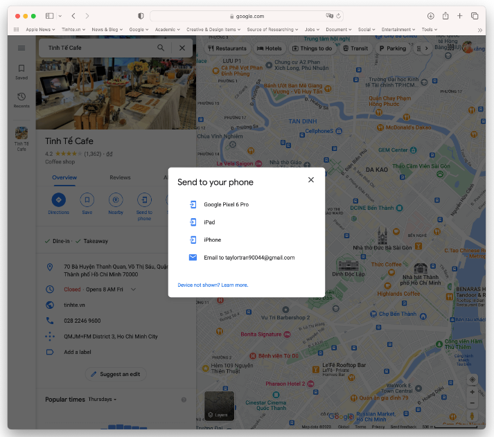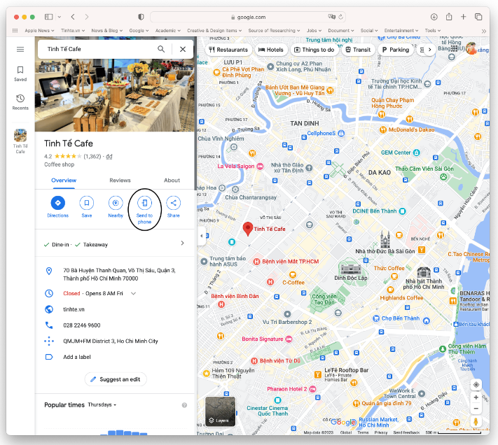 Nếu anh em đang dùng máy tính mà tìm được một địa điểm ăn uống cà phê nào đó hay hay thì có thể gửi định vị địa điểm đó tới điện thoại và lưu lại, lúc đi có cái bản đồ để đi hoặc cần đi nhanh thì có thể gửi đến điện thoại và mở bản đồ lên đi ngay, tính năng này sẽ hoạt động được trên hầu hết hệ điều hành. Dưới đây là cách và flow giúp anh em tìm và gửi đến điện thoại nhanh: