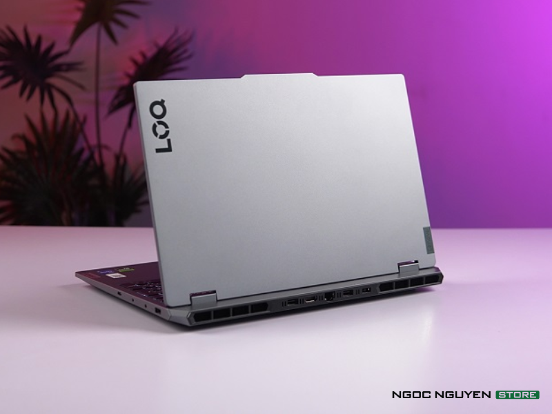 Thiết kế của Lenovo LOQ 15ARP9 cực kỳ sang đẹp, các lỗ khe tản nhiệt được thiết kế to và dày bản phía sau. Phần bản lề màn hình được thụt vào một đoạn so với khung máy. Các góc cạnh của máy được trau chuốt với độ tỉ mỉ cực cao kết hợp cùng với khu vực mặt A được làm bóng khoác lên lớp màu Storm Grey vô cùng sang trọng và cuốn hút. Cùng với đó là logo mới cũng được đặt trên khu vực góc cạnh để tăng tính nhận diện thương hiệu.