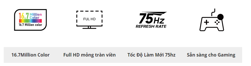 Tần số quét 75Hz vượt trội giúp mọi chuyển động trở nên mượt mà hơn, cho bạn dễ dàng bắt kịp các khoảnh khắc ấn tượng trong những phân cảnh thú vị. Giờ đây, bạn có thể thưởng thức mọi nội dung đỉnh cao và trải nghiệm những trận game gay cấn mà không có hiện tượng giựt hình hay bóng mờ khó chịu. Hỗ trợ các tính năng chơi game cho người dùng :