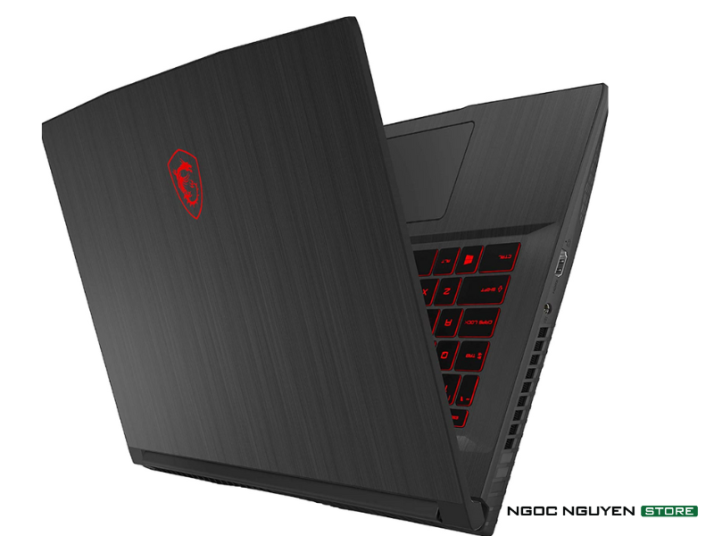 Toàn thân MSI GF63 có màu đen chủ đạo với những điểm nhấn màu đỏ như logo MSI. Phần quạt thông gió hình chữ X ẩn dưới thân máy, tạo nên sự thanh thoát và liền khối trong thiết kế tổng thể.