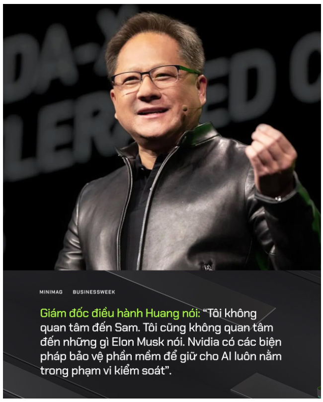 Đáp trả lại những lo ngại này, Giám đốc điều hành Huang nói: “Tôi không quan tâm đến Sam. Tôi cũng không quan tâm đến những gì Elon Musk nói. Nvidia có các biện pháp bảo vệ phần mềm để giữ cho AI luôn nằm trong phạm vi kiểm soát”.