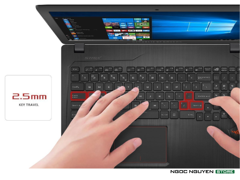 Laptop ASUS GL553VD sở hữu một bàn phím chiclet được thiết kế đặc biệt với ánh sáng RGB 4 khu vực và cơ cấu nút phím dạng kéo có đèn nền màu đỏ và hành trình phím là 2,5mm cho một trải nghiệm đánh máy chắc chắn. Bàn phím còn có các phím WASD được in màu để bạn luôn biết vị trí để tay của mình. Thêm vào đó, dấu cách lớn hơn và các phím mũi tên tách biệt đảm bảo rằng mọi thứ bạn cần đều luôn nằm trong tầm với. Cổng USB Kiểu C xoay ngược được cho bạn khả năng kết nối thiết bị dễ dàng hơn và tốc độ truyền tải dữ liệu siêu nhanh.