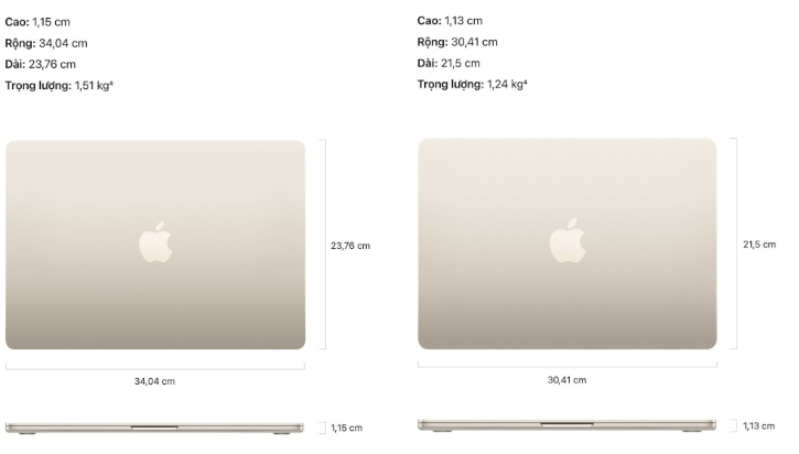 Kích thước & khối lượng máy: MacBook Air 15" M2 có kích thước 34,04 x 23,76 cm, MacBook Air 13" M2 có kích thước 30,41 x 21,5 cm. Độ dày của MacBook Air 15" M2 là 1,15 cm, nhỉnh hơn một chút so với phiên bản 13" là 1,13 cm. Khối lượng phên bản MacBook Air 15" là 1,51 kg không phải là nhẹ nhất phân khúc máy con số vẫn nhỏ hơn phiên bản MacBook Pro 14".