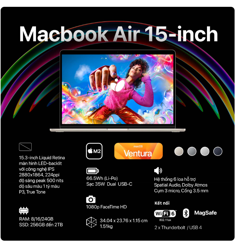 Kích thước màn hình: MacBook Air 15" M2 có kích thước 15,3" độ phân giải 2880x1864 pixel, phiên bản 13,6" là 2560x1664 pixel.