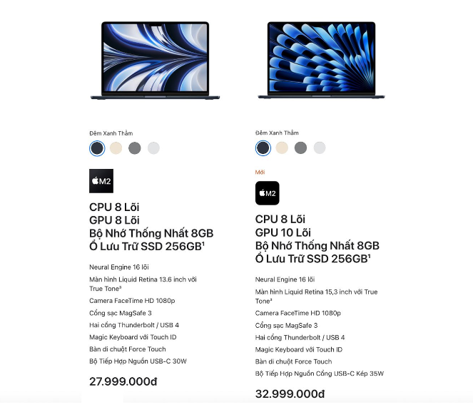 Như vậy, mức giá phải trả để anh em cân nhắc phiên bản cấu hình cơ bản của chiếc MacBook Air 13" M2 so với MacBook Air 15" M2 chỉ là 2,5 triệu theo giá Apple Store online Việt Nam.