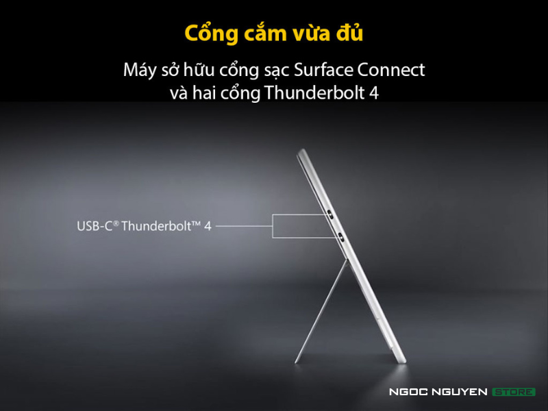 Ngoài việc có ngoại hình tương đồng với thế hệ tiền nhiệm, số lượng cổng kết nối mà nhà sản xuất trang bị trên Surface Pro 9 cũng tương tự khi máy sở hữu trên mình cổng sạc Surface Connect và hai cổng USB Type-C hỗ trợ giao thức kết nối Thunderbolt 4 để người dùng có thể sạc hoặc mở rộng thêm bàn phím, màn hình tùy thích.