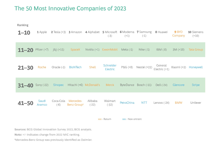 Báo cáo mới từ công ty phân tích BCG đã xếp hạng những công ty sáng tạo nhất thế giới trong năm 2023 dựa trên trọng tâm đổi mới của từng công ty trong năm qua cùng với việc ứng dụng các công nghệ mới như trí tuệ nhân tạo chẳng hạn.