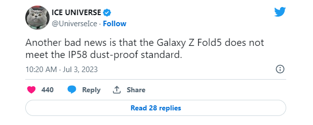 Tài khoản Ice Universe cũng bổ sung thông tin về dòng smartphone gập mới, cho rằng máy sẽ không đạt chứng chỉ kháng bụi IP58. Dòng Galaxy Z Fold4 hiện nay đã đạt chứng chỉ kháng nước IPX8, và cũng có các biện pháp để chống bụi lọt vào bên trong nhưng vẫn không đạt được chứng chỉ IP, và có lẽ thế hệ thứ 5 cũng sẽ là tương tự.